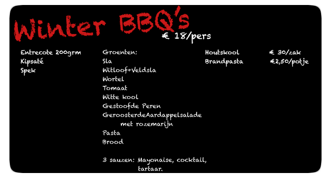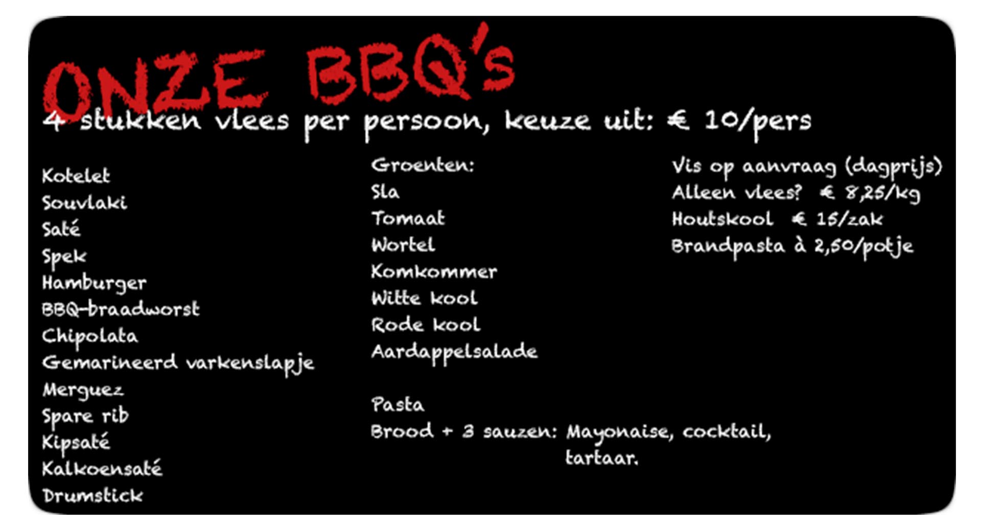 | Kip/Varkens/Runds/Kalkoen | € 10/pp |